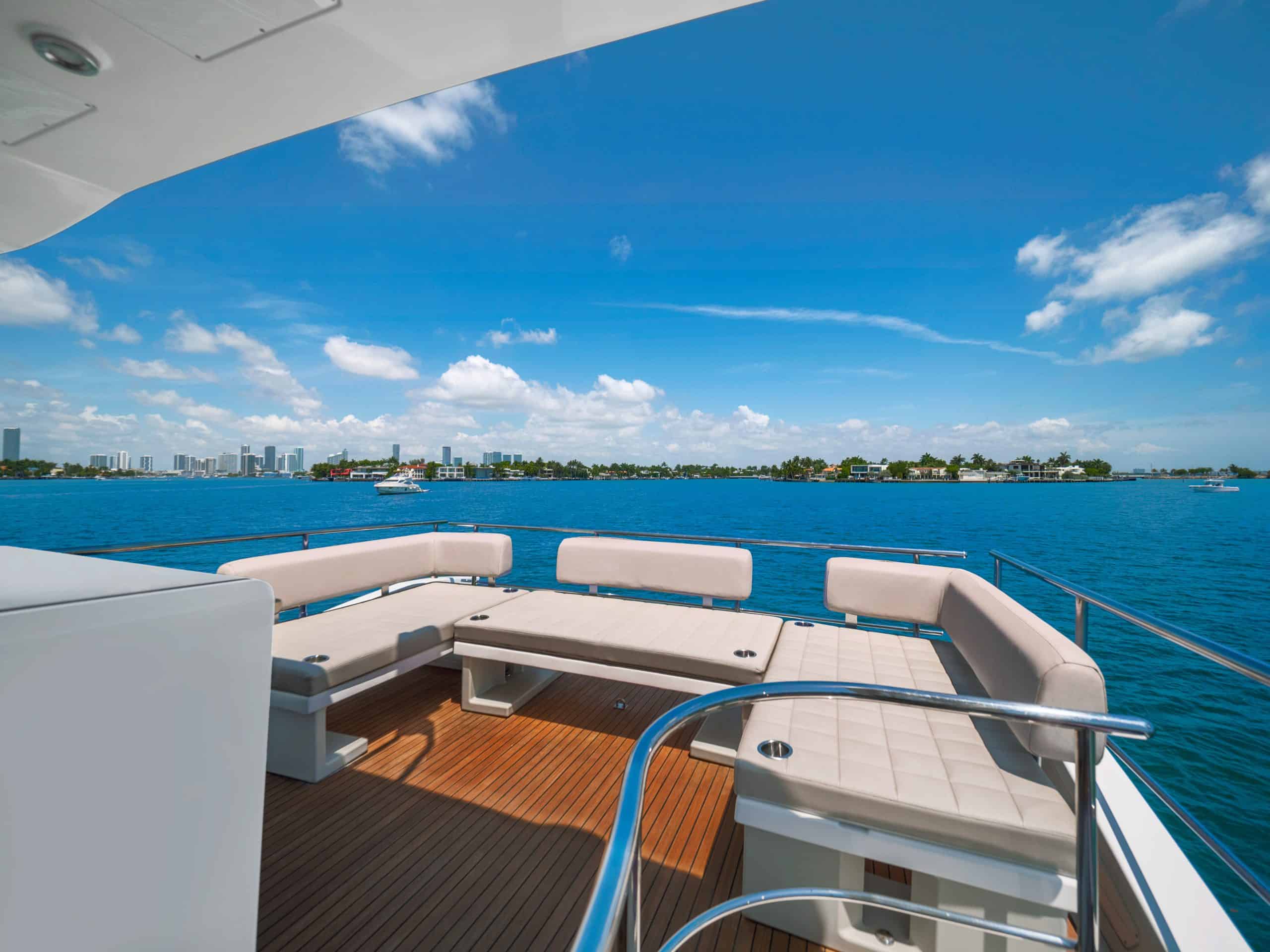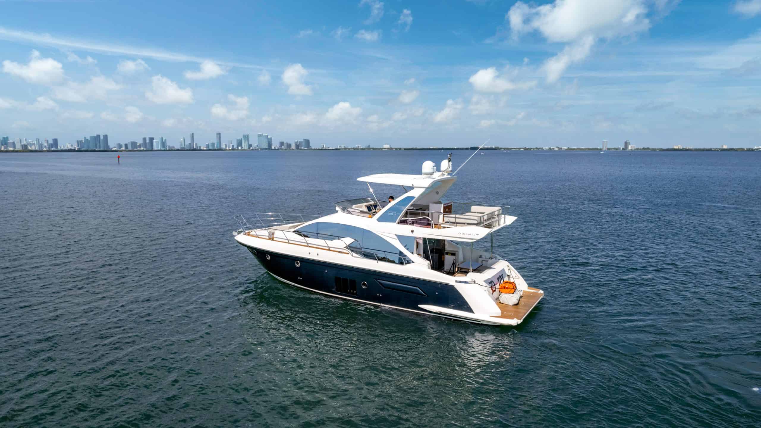 Our Azimut 50 responded immediately to throttle advance, and we were quickly at cruising speed. The boat seemed oblivious to the conditions, and ran as smoothly as it would on a flat lake. Heading into the waves, the hull tracked straight, with almost no reverberation from bow entry. It held turns tightly at 23 knots. At a top speed of 32 knots, it hardly felt like we were moving at all. The ride was very smooth and dry. Considering the conditions, we couldn't have asked for a nicer day on the water.